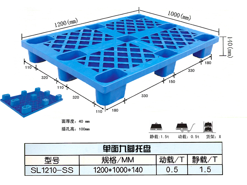 九腳網(wǎng)格塑料托盤(pán):九腳網(wǎng)格托盤(pán)其底部是有‘九個(gè)腿’組成的,表面為‘網(wǎng)格’狀,顧行業(yè)為方便稱其為九腳網(wǎng)格托盤(pán)(如圖),九腳網(wǎng)格托盤(pán)大多型號(hào)的都為輕型的塑料托盤(pán),不易用于上貨架或者較重貨物的周轉(zhuǎn)使用,大多情況下九腳網(wǎng)格塑料托盤(pán)都是用來(lái)倉(cāng)庫(kù)貨物墊倉(cāng)板防潮使用,對(duì)于輕型貨物的周轉(zhuǎn)也可。